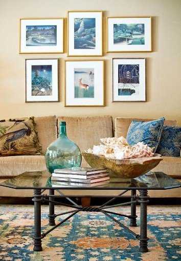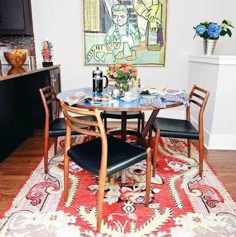 Повторение орнамента и стилистики — более сложный вариант, так как скорее всего тяжело будет найти подходящие детали с тем же или похожим узором. В этом случае можно вышить орнамент своими руками на декоративных подушках или скатерти, нарисовать картины или украсить стены фотографиями фрагментов этого же или других ковров. Этот декоративный прием может использоваться в интерьерах кантри, минимализма, классики.