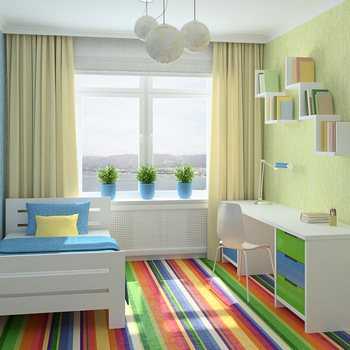 В детской комнате трудно ошибиться с расцветкой ковролина, ведь чем живее будет интерьер, тем интереснее ребенку будет в ней находиться. Главное, что нужно учесть, это единый тон, чтобы перенасыщенные краски не выбивались среди других плиток.