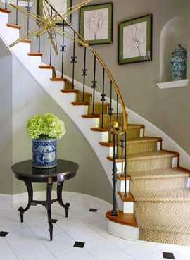 Ковровая дорожка на лестнице смотрится просто великолепно, наполняет помещение атмосферой царственности и величественности. Вы можете выбрать для украшения лестничного марша кремлевские или красные ковровые дорожки. Они добавят торжественности и придадут комнате богатый и роскошный вид.