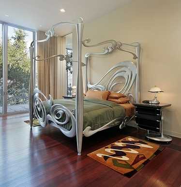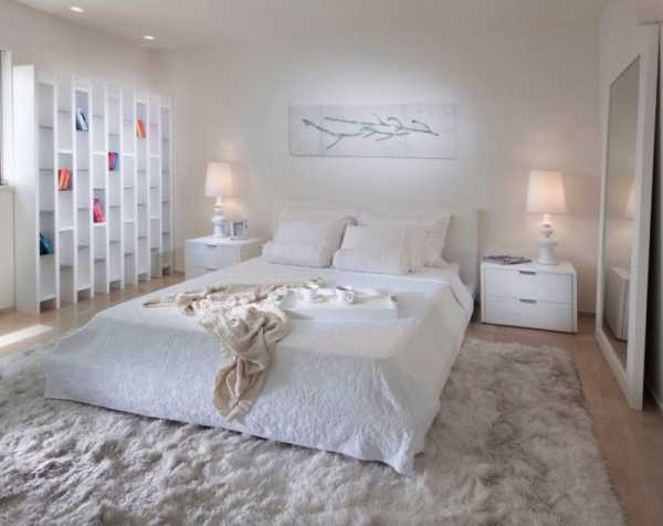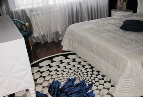 Так, выбрав классическую схему, под кровать можно постелить большой овальный ковер. В современной спальне с двух стороны от кровати могут быть расположены коврики-шкуры произвольной формы.