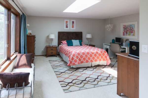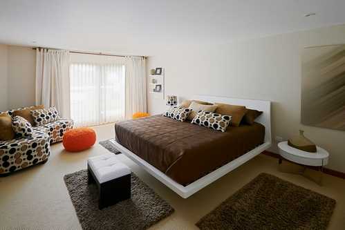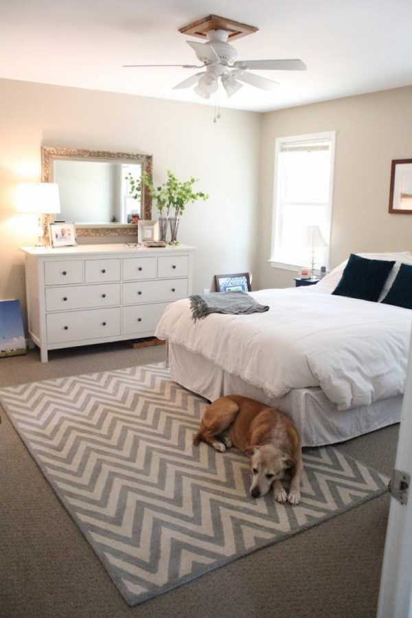 Если спальня выглядит как бы размытой, потому что цвет пола, мебели и текстиля на окнах практически совпадает, контрастный ковер спасет положение. Он сыграет роль разделителя уровней, что привнесет в интерьер равновесие и порядок.
