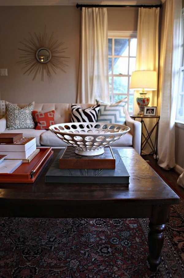 Первое, что нужно запомнить, это выбирать для аксессуаров ближайшие по цвету ковра оттенки. Стоит использовать съемные аксессуары (различные шторы, картины, подушки, вазочки). Не обязательно, чтобы вещи подходили в точности к цвету ковра в интерьере, но выглядеть они должны гармонично и их оттенки сочетались друг с другом.