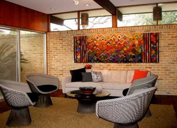 Очень стильно и необычно на кирпичной стене выглядит ковер с ярким геометрическим рисунком.