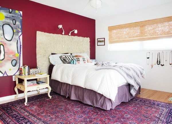 Интерьеру спальни придаст особый уют ковер шегги, повешенный на стену у изголовья кровати.