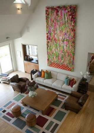Не стоит ограничивать комнату большого размера только одним ковром. В этой студии дизайнеры использовали сразу несколько ковриков, что выделить зону отдыха и пространство для занятий йогой. При этом целостность всего дизайна интерьера сохраняется за счет их скоординированных расцветок.