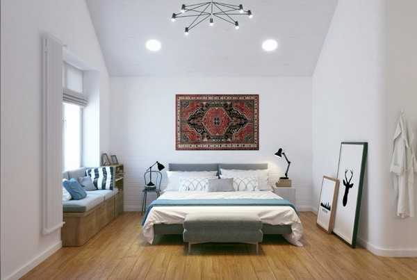 В спальню не следует стелить большой ковер. Это бессмысленно, ведь большая часть ковра все равно будет под кроватью. Используйте лучше небольшие декоративные коврики. Можно несколько штук разложить хаотично по комнате. Тем самым вы подчеркнете стиль и индивидуальность комнаты и сэкономите свой бюджет.