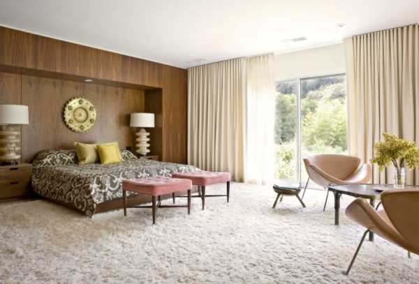 Поскольку речь идет о спальне, лучше отдать предпочтение ковру из натуральных материалов с длинным ворсом, чтобы ногам было приятно ступать на него.