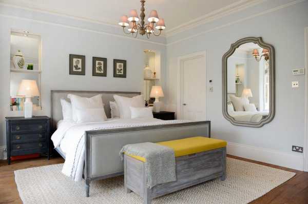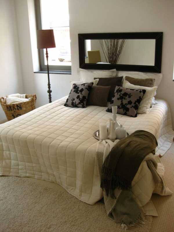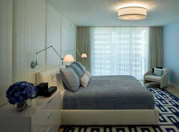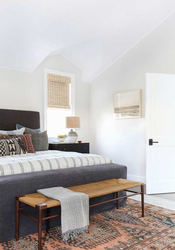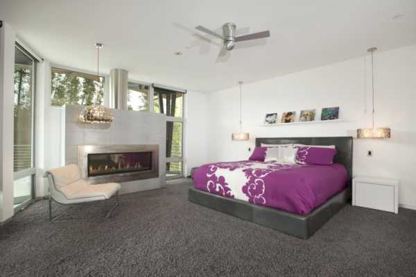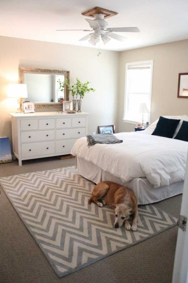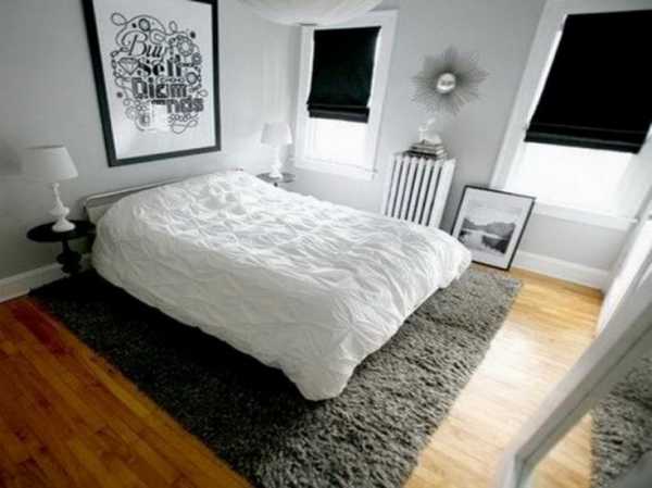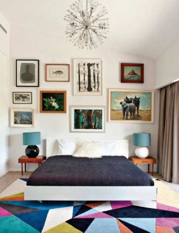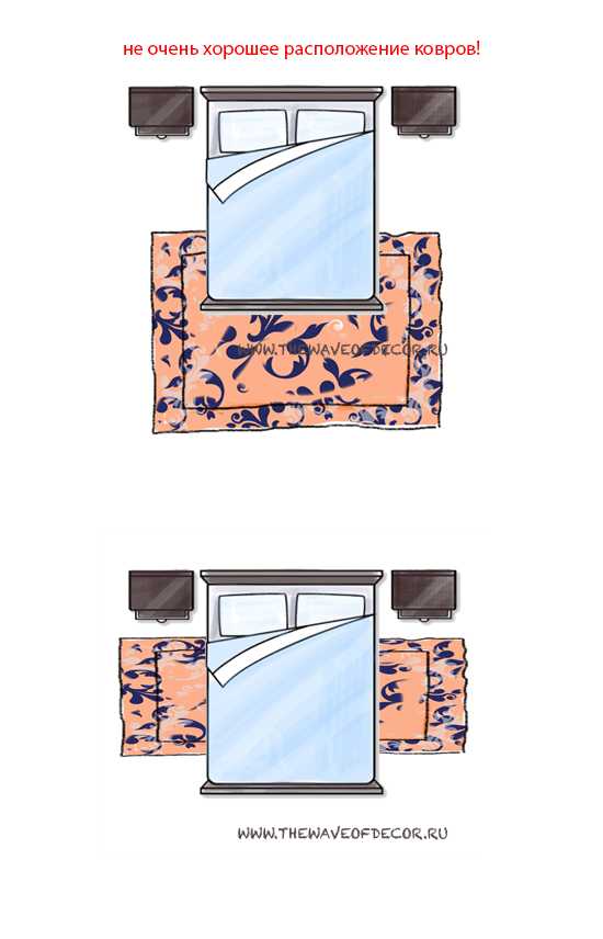 - Современная схема. Можно развернуть и уложить ковер поперек кровати, сместить его от изголовья к изножью.