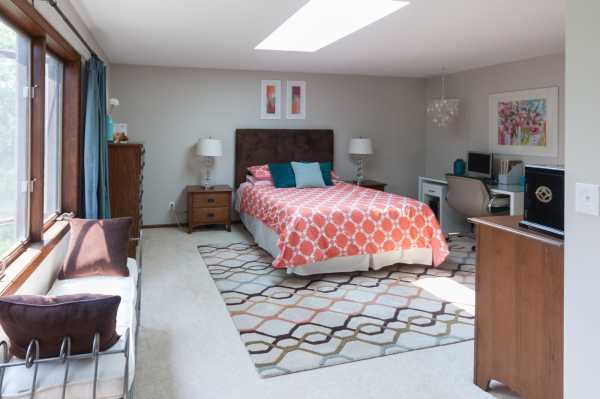 - Ввести дополнительные цветовые решения. Здесь берется яркое ковровое покрытие, а оттенок может поддерживаться декоративными подушками на кровати или светильником на прикроватной тумбочке.