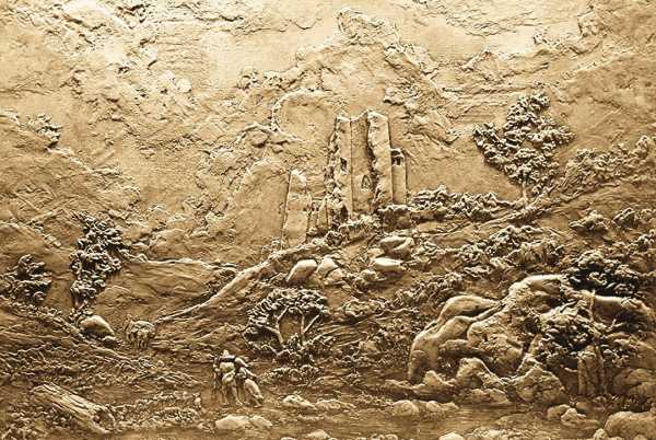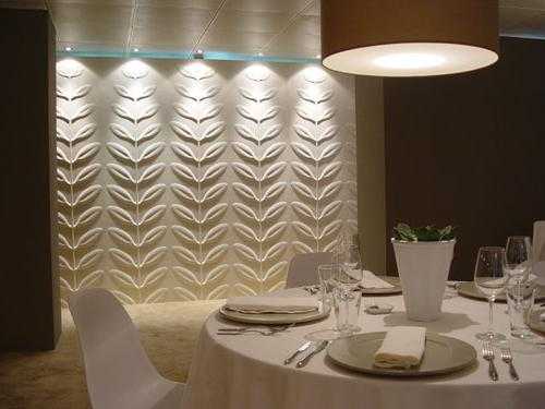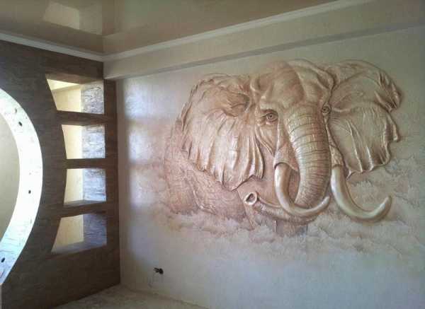 Создание инсталляций из гипсовой шпаклевки по технологии похоже на работу со штукатуркой. Разница в том, что рельефные узоры и рисунки из гипса выполняются руками, с помощью шпателя или же особого шприца. Для этого на стену предварительно наносится эскиз будущей картины, поверх которого выполняется лепнина. При этом подготовка к созданию панно необходима такая же, что и в случае со штукатуркой.