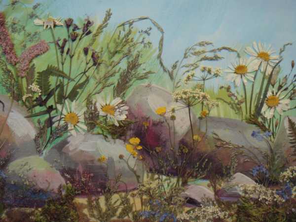 Панно из засушенных природных материалов привнесут в ваш интерьер частичку лета и подымут настроение в холодные зимние дниДля начала необходимо на сухой бумаге собрать нужную композицию, для того чтобы увидеть общую картину, после чего перенести все на текстильную основу, закрепив при помощи клея. После того, как клей высохнет, панно закрывается стеклом и помещается в рамку.