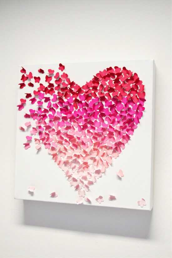 - Нарисуйте контур фигуры (например, сердца, как здесь) и заполните его маленькими приклеенными бабочками.