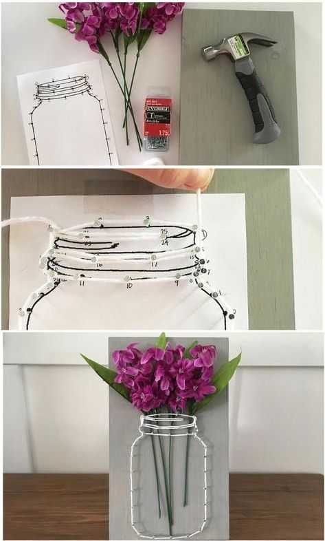 Плетение из ниток на гвоздях (стринг арт) – еще один простой способ украсить стену оригинально. Гвозди забивают по контуру рисунка, нанесенного на бумажный трафарет, а затем трафарет удаляют и оплетают гвоздики нитками, получая картину. Вместо гвоздей можно взять булавки с красивой головкой или кнопки.