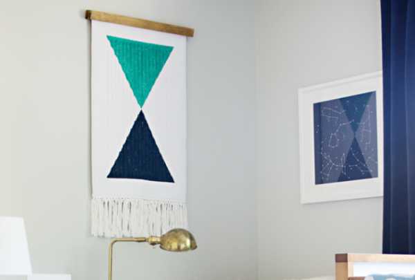 Для создания такого панно вам понадобится холст, малярный скотч и краска. Выберите геометрический узор, который хотите отобразить, сделайте на холсте с помощью малярного скотча его трафарет, и нанесите краску. Когда краска высохнет, снимите малярный скотч, и прикрепите картину на стену.