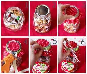 С помощью обычной банки и красиво декорированной крышки можно оформить особенный сладостный подарок. Декорируйте банку, разрисуйте стойкими маркерами или обклейте цельными кофейными зернами (блестками, стразами). На ней сделайте подпись «Лекарство от грусти» или «Для радостных моментов» и наполните различными конфетами или леденцами. Подписи могут быть и такими: «Для самого милого человека», «Сладкие приятности жизни».