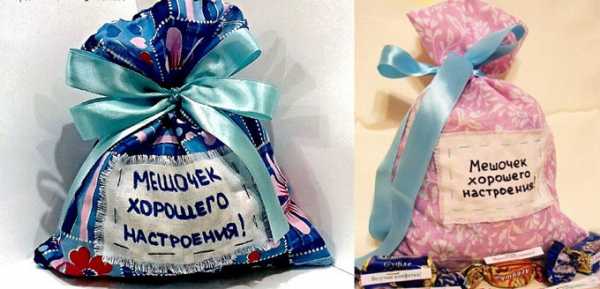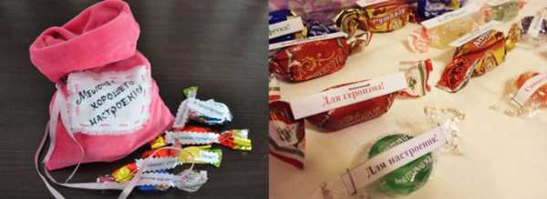 Аккуратно слаживаем конфетки в мешочек, завязываем красивой ленточкой. Снаружи прикрепляем надпись «Мешочек с хорошим настроением».