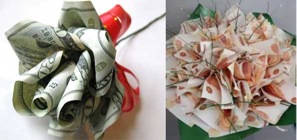 Как известно, деньги – самый практичный и традиционный подарок. Но просто вручить купюры не интересно. Проявите немного фантазии и оформите деньги в интересный подарок. На свадьбу можно подарить прикольный подарок из денежных купюр в виде ковра, торта, зонта, фрегата и т.д.