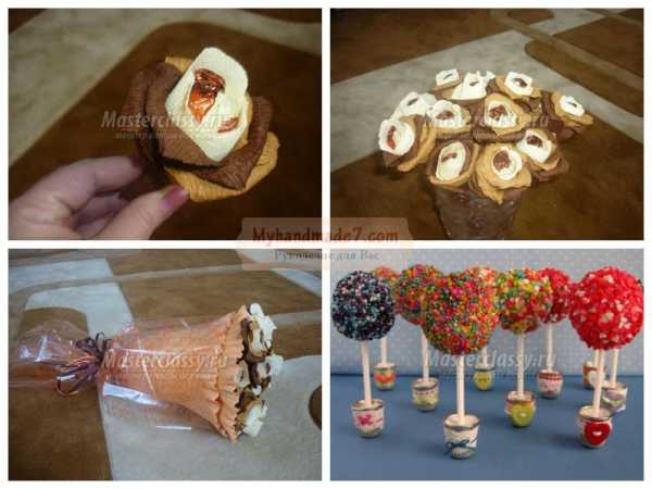 Последнее время особенно популярны букеты и композиции из сладостей, где им вместо цветов придают интересные формы, декорируют и украшают. Вы сами можете придать сладостям различные фигуры в зависимости от избранного подарка.
