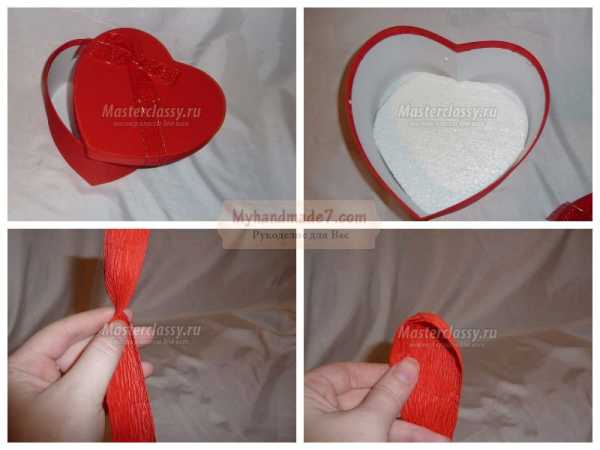 Перед тем как наполнить сердце, нужно задекорировать боковинки, для этого отрежьте полоску гофрированной бумаги контрастного, так чтобы ее хватило обернуть весь периметр коробки. Сложите полоску вдоль, чтобы ее ширина была ровна ширине боковины коробки. Сгиб будет служить в качестве верхнего края, чтобы он выглядел красивее нужно слегка растянуть бумагу по сгибу. При помощи клеевого пистолета фиксируем бумагу на стенках коробки изнутри. Согласитесь, так коробка выглядит гораздо наряднее.