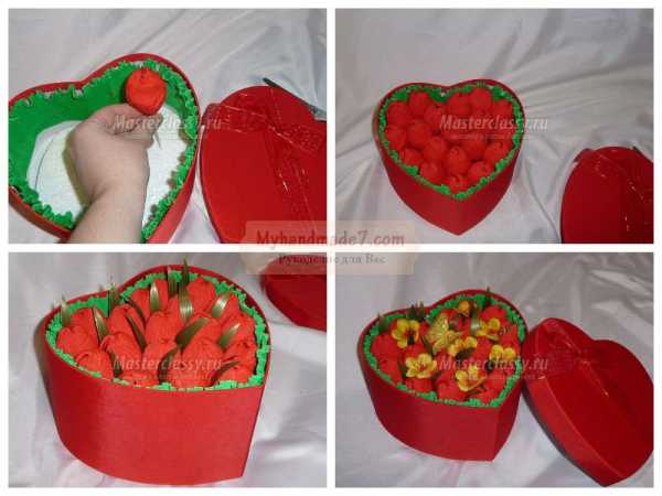 Теперь давайте посмотрим, как оформить красивый подарок на день Рождения своими руками. Материалы нам понадобятся практически те же, что в первом варианте, мы будем мастерить подарочное сердечко со сладкими тюльпанами. Важно подобрать для поделки красивую коробку с крышкой, вообще не обязательно, чтобы она была в форме сердца, вы можете взять круглую или любой другой формы. Вырезаем пенопласт по форме коробки, закладываем его во внутрь, в него мы будем вставлять шпажки с тюльпанами.