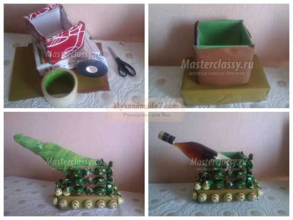 Согласитесь, что коллеге или любимому мужчине тоже хочется преподнести необычный подарок на день Рождения своими руками. Хочу представить вам несколько оригинальных вариантов. Было бы неправдой сказать, что мужчины не любят сладкое, но торт дарить слишком банально, а вот если оформить подарок исходя из увлечений получателя, это уже совсем другое дело. Среди современных мужчин очень популярна компьютерная игра «Танчики», давайте удивим вашего мужчину подарком в виде танка. Для работы нам будут нужны: Пара ненужных коробок разного размера, различные конфеты в обертке, бутылка спиртного (коньяк, ром или виски, выбор за вами), ножницы, двусторонний скотч, зубочистки или бамбуковые шпажки, упаковочная бумага зеленого или другого подходящего цвета.