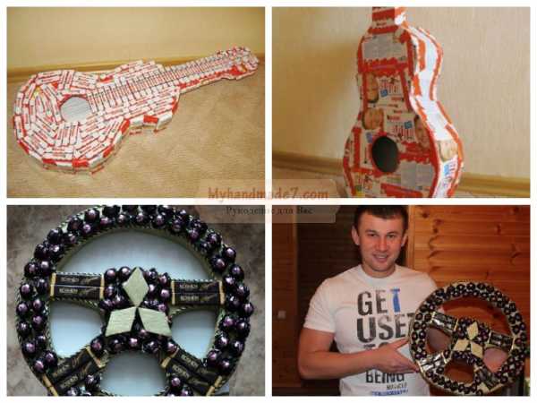 Склеиваем коробку гитары при помощи скотча. Всю поверхность обклеиваем обертками от шоколадок. Основа готова. Теперь поверх оберток приклеиваем сами шоколадки, необязательно использовать киндер, можно взять любые конфеты с плоским основанием. Замостить нужно максимально плотно, но даже если будут оставаться просветы, это не критично, из-за того что мы предварительно обклеили поверхность обертками они будут практически незаметны. Для большего сходства с настоящим инструментом, натягиваем из толстых ниток струны. Освоив такую нехитрую технику, вы можете выполнить макет любого инструмента и оформить его индивидуально для вашего сладкоежки.