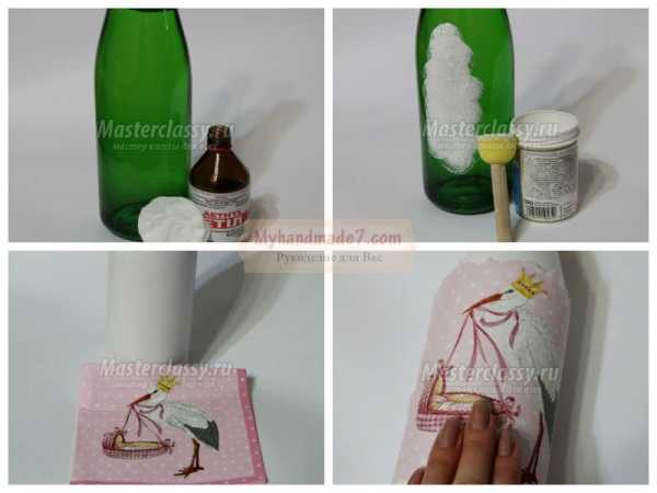 Теперь всю стеклянную поверхность бутылки плотно покрываем акриловой белой краски. Это удобно работать кусочком губки. Когда краска полностью высохнет, нанесите еще один – два слоя, чтобы бутылка не просвечивала. Подберите соответствующий поводу рисунок, у меня это салфетка с аистом, вы же можете выбрать любую другую, главное чтобы рисунок подходил для поздравления новорожденного. Вся салфетка нам не понадобится, вырежьте необходимый фрагмент. Далее приступаем непосредственно к декупажу – есть несколько способов приклеивания салфетки на поверхность. При «сухом методе» место куда в последствии будет приклеена салфетка намазывают акриловым лаком, оставляем немного подсохнуть, но не полностью. Поверх полувысохшего лака прикладываем фрагмент салфетки и аккуратно, не торопясь разглаживаем его по направлению от центра к краям. Сверху наносим еще слой лака. Чтобы не было видно краев салфетки, оставшуюся незаклеянной поверхность бутылки нужно задекорировать в тон, у меня это розовый цвет, поэтому я добавляю в белую акриловую краску каплю красного колера. Кусочком губки наносим краску по всех поверхности, немного заходя на края салфетки. Когда краска высохнет, зафиксируем все слоем лака. Если после высыхания лака на бутылке образовались складки или шероховатости их легко удалить при помощи мелкой наждачной бумаги. У меня на салфетке присутствуют белые кружочки, поэтому чтобы фон был одинаковым, при помощи белого акрилового контура я рисую капельки по поверхности бутылки.
