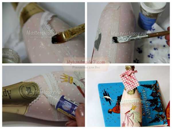 Чтобы выделить рисунок обведите его по контуру акриловой краской с жемчужным эффектом. Рисунок красиво будет оформить рамкой, для этого возьмите ажурное кружево, по контуру бутылку намажьте слоем лака, тоже сделайте с кружевом. Лака достаточно чтобы кружево держалось крепко, главное дайте ему хорошенько высохнуть. Когда кружево высохнет, можно затонировать его краской. По контуру фольги жемчужным контуром ставим точки или рисуем узор, всю композицию напоследок еще раз покрываем слоем лака. Вместо обычной открытки вырезаем из скрап бумаги фигурными ножницами маленькую этикетку, пишем на ней все пожелания и поздравления, крепим ее на горлышко бутылки при помощи атласной ленты.