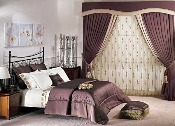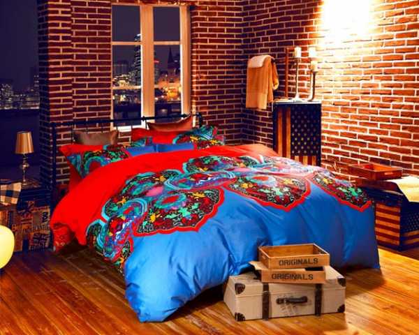 Можно использовать яркие расцветки. Покрывало со шторами для спальни позволит создать единую гармоничную композицию.