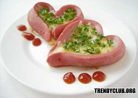 Сосиски разрезаем вдоль, не доходя до конца пару сантиметров. Выгибаем половинки в обратную сторону, чтобы получилось сердечко, скрепляем концы зубочисткой. Сосиски можно предварительно опустить в кипяток на пару минут, чтобы стали «податливее». Обжариваем сердечки с одной стороны, переворачиваем и вбиваем внутрь яйцо. Солим, перчим. Готовую яичницу выкладываем на тарелку, посыпаем зеленью. Сердечко, кстати, можно «пронзить» стрелой из кетчупа. Главное — не забудьте перед подачей вынуть зубочистки.