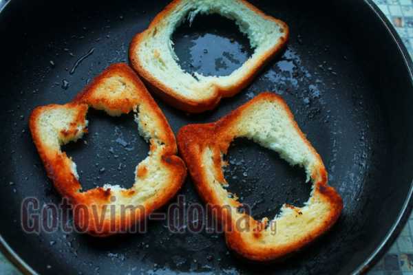 Обратите внимание! Хлеб лучше использовать вчерашний. Со свежим хлебом тоже получится вкусно, но он может пойти волной на сковородке и жидкое яйцо, разбитое в ломтик хлеба, может вытечь из хлебной формочки. Чтобы этого не произошло, на всякий случай прижимайте периодически все ломтики хлеба лопаткой к сковороде во время обжаривания. Хлебные формочки должны получиться ровными.