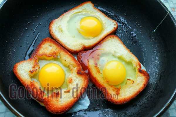 4. Далее аккуратно разбиваем яйца в серединку хлеба. Продолжаем готовить 2-3 минуты на медленном огне. Следите за тем, чтобы ломтики хлеба плотно прилегали к сковороде и яйца не вытекли.