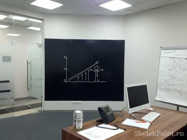 Стены, покрытые черной маркерной краской, встречаются во многих офисных помещениях. Рисовать на них можно любыми маркерами, кроме перманентных.
