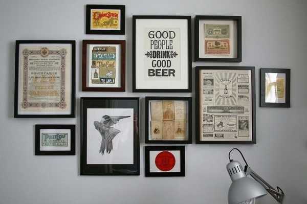 Сперва отберите весь декор и изображения. Не бойтесь смешивать большое и маленькое, яркое и однотонное. Картина в пышном багете может отлично смотреться рядом с фоторамкой под стеклом без всякого обрамления. Просто выберите то, что давно заслуживает видного места.