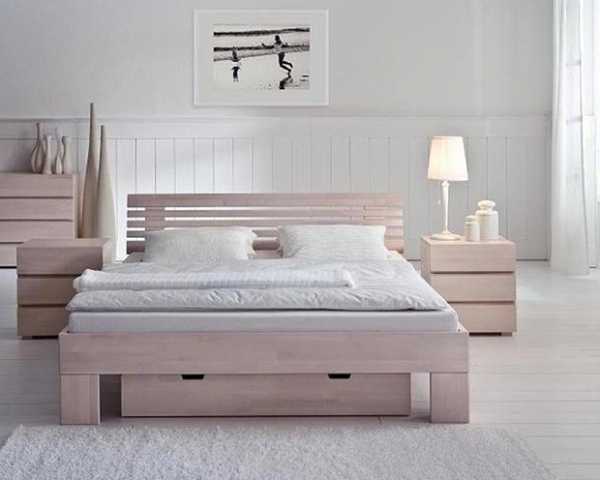 Наиболее дорогие спальные кровати из натурального дерева – бука, ольхи, березы, дуба, сосны. Изделия красивые внешне, однако, цвета ограничиваются только древесными оттенками, и они могут не вписываться в уже готовый интерьер. Требуют бережного ухода, поддержания определенной температуры и влажности в помещении, защиты от перепадов температур и древесных вредителей.