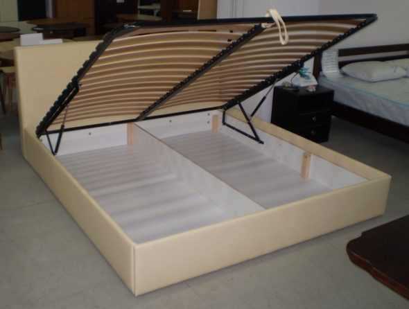 Кровати с подъемным механизмом имеют огромную бельевую нишу, размер которой соответствует размеру спального места. Подъемный механизм может быть на пружинных или газовых амортизаторах.