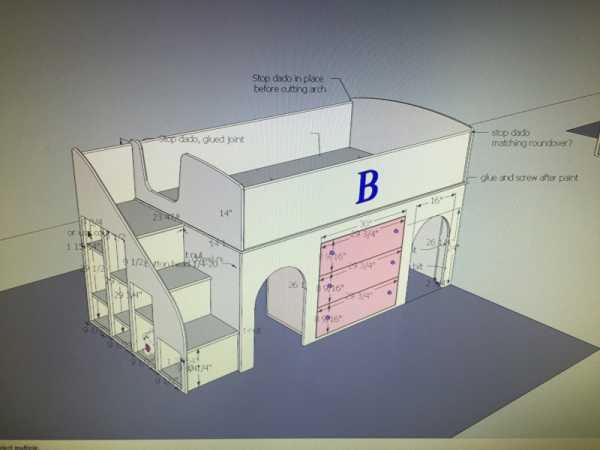 При разработке кровати я хотел объединить другие предметы мебели. Таким образом у нас получилось все в одном. Давно я видел несколько подобных инструкций в журнале, но, как правило, на «первом» этаже у них был стол или диван. Мне де хотелось предоставить дополнительное место для игр. Перед тем как начать я потратил почти год на проект.