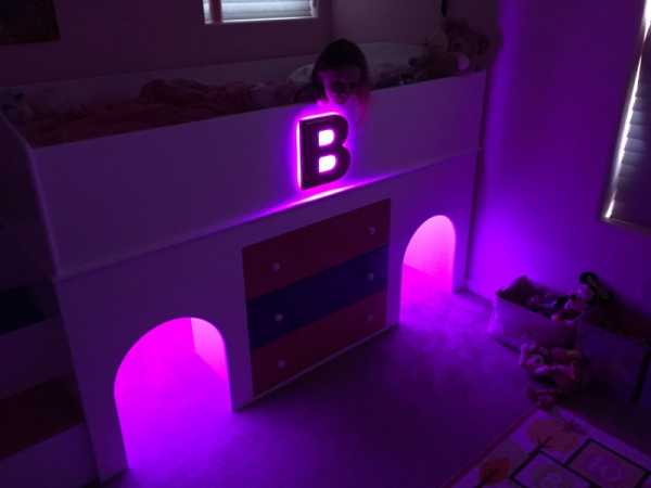 Он хотел, чтобы игровая комната светилась розовым, поэтому он добавил несколько светодиодных ламп к основанию. Игра под кроватью в розовом свете вдвойне интересна!