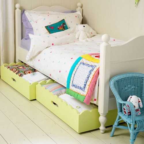 - изголовья и бортики кровати могут быть оформлены в виде замка, дворца, дома, волн. Иногда присутствуют мягкие изголовья с разными рисунками, цветами, узорами;