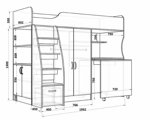 - многофункциональность всей конструкции позволяет ее использовать не только в качестве спального места. Наличие под верхним ярусом стола, шкафчиков позволяет установить компьютер и сложить все школьные принадлежности;