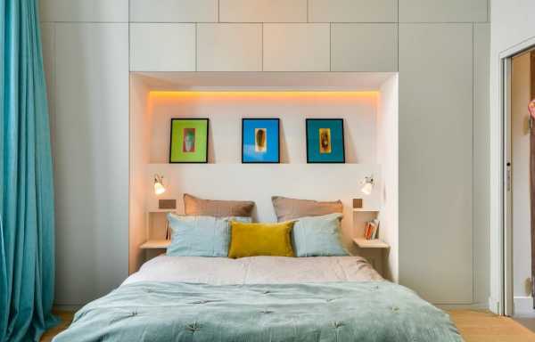 Если комната не оснащена нишей, то ее можно сделать искусственно, выделив место для кровати, а оставшееся пространство стены использовать как систему хранения, разместив там полочки, а если пространство позволяет – то и полноценный шкаф.