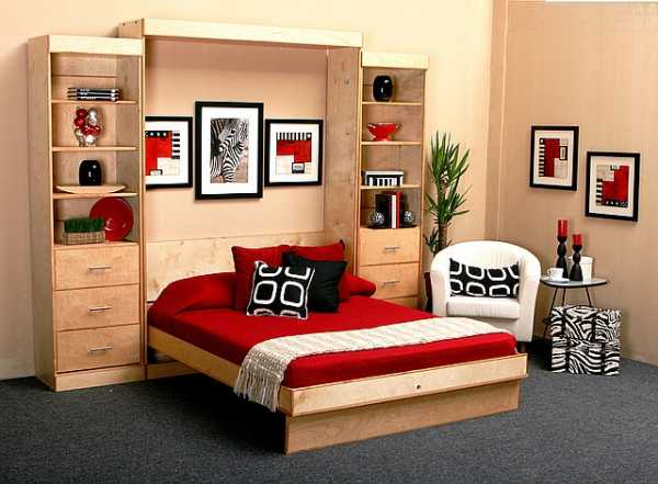 Особой популярностью пользуются спальные места, встраиваемые стену – обычные кровати занимают довольно много места, которое можно бы использовать днем для других целей.