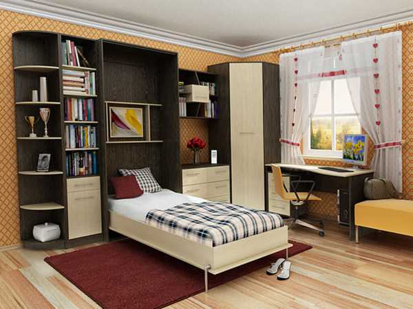 Более сложный вариант — трансформирующаяся кровать, которая в вертикальном положении образует стенку шкафа. Поднимать и опускать такую кровать легко с помощью специального механизма.