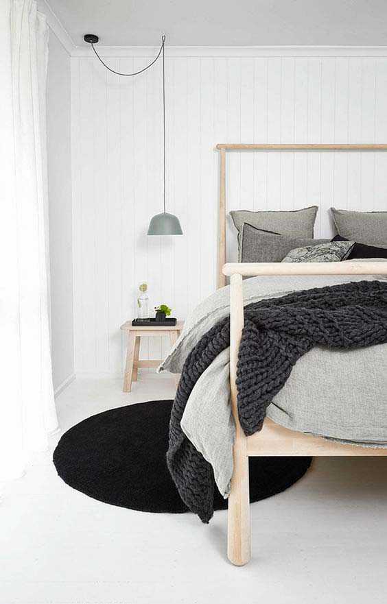 Помимо цвета есть и другие способы придать вашей спальне визуальную контрастность. Когда речь идет о скандинавском стиле, одним из таких способов может стать разнообразие текстур. Мягкие коровьи шкуры, выполняющие функцию прикроватных ковриков, стены, оббитые натуральным деревом, и намек на сверкание меди в форме подвесного светильника… Подобные детали оказывают действительно большое влияние на общую атмосферу спальни и при этом великолепно вписываются в скандинавский стиль. Уделите внимание выбору каркаса кровати: он должен быть изящен и сделан из натурального дерева.