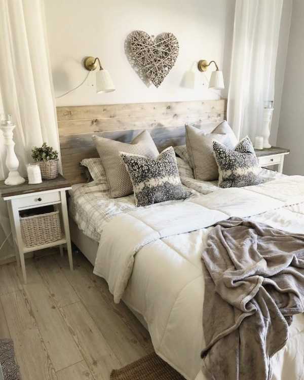 - Аксессуары – на кровати могут лежать уютные подушки, на стенах висеть картины в натуральных рамах светлого цвета. Зеркала также будут уместны – они визуально расширят спальню.