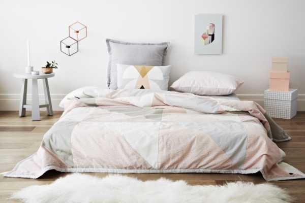 - Клетка и серый цвет. Клетчатые мотивы также широко применяются для оформления интерьера в скандинавском стиле. Если кровать выполнена в серых оттенках, стоит выбрать клетчатое покрывало или постельное белье.