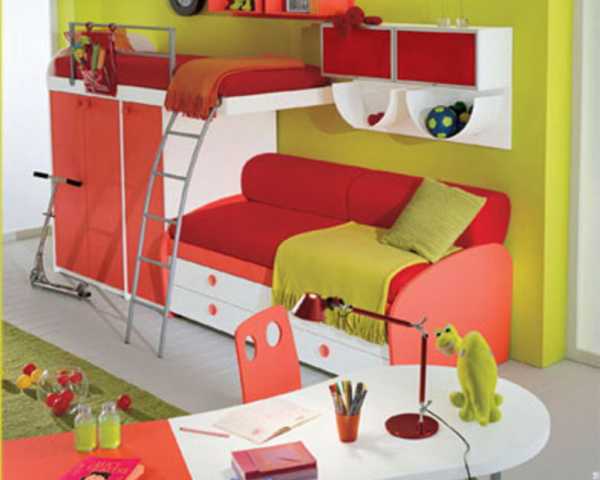 Пространство для ребенка должно делиться на несколько зон, только тогда оно будет максимально комфортным и функциональным. Здесь должно быть место для игр, чтения книг, спокойного, полноценного сна. Если комната не отличается внушительными размерами, поместить здесь полноценную кровать, диван и игровую площадку не получится. На помощь придет двухэтажная кровать с мягким диваном.