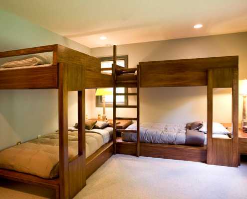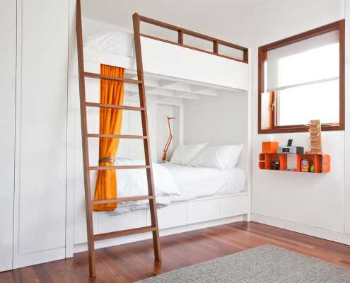 В домах, где проживают многодетные семьи и между детьми незначительная разница в возрасте, кровати-чердаки лучше всего вмонтировать в имеющиеся ниши вдоль одной стены. Подобные встроенные конструкции значительно экономят пространство и служат местом для полноценного отдыха: