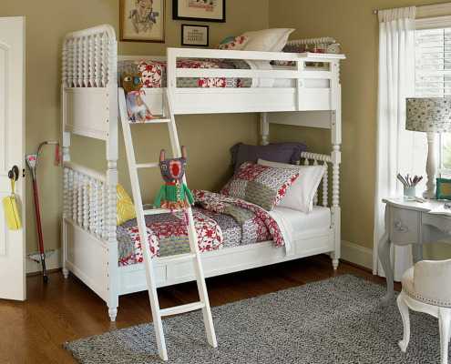Вариантов оформления двухъярусных кроватей очень много. Они могут быть частью определенного стиля интерьера, объединены одной темой, или же составлять ансамбль в цветовой гамме. Например, в белом исполнении, кровать подчеркнет впечатление чистоты и спокойствия в светлой комнате: