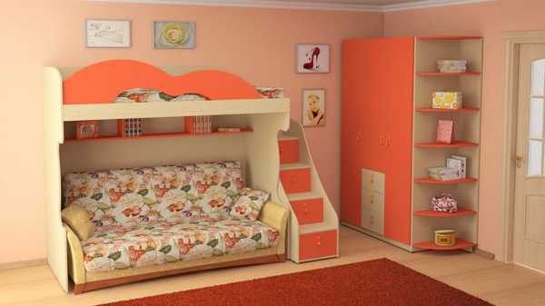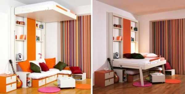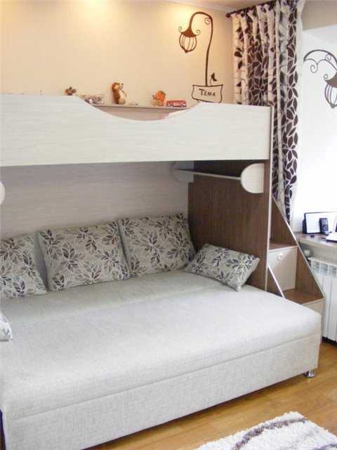 Не менее полезна мебель и для малогабаритных двушек в хрущевке, где проживает двое деток разного возраста. Ограниченность пространства подобного жилья вынуждает их владельцев придумывать все новые и новые способы экономии пространства каждого помещения. Иными словами, диван в сложенном виде вполне подойдет для сна малыша, а верхний для более взрослого ребенка или подростка.